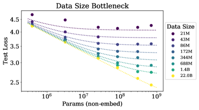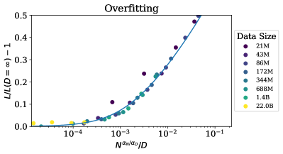 N과 D가 동시에 증가한다면 성능이 증가하는 것은 예측가능하지만, N이나 D중 하나만 증가하고 하나는 고정한다면 성능이 감소하는 단계로 들어갑니다. 성능에 대한 penalty는 N^0.74/D 의 비율을 따라 결정됩니다. 즉 model의 크기가 8배 증가한다면, data의 크기는 5배가 증가해야 penalty를 피할 수 있다는 의미입니다 (section 4). *perfomance가 penalty없이 증가하려면 N과 더불어 D도 같이 scale up해야합니다.