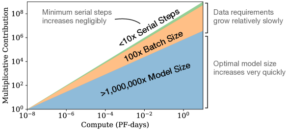 모델을 훈련시키기 위한 최적의 배치사이즈는 대략 손실의 거듭제곱입니다. 이는 [MKAT18] gradient noise scale을 통해 측정될 수 있습니다.
