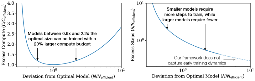 optimal model size 주변을 보았을 때, optimal size부터 일부 구간 (0.6x ~ 2.2x) 까지는 computing budget의 증가가 크게 두드러지지 않지만, 해당 구간을 벗어나면 굉장히 큰 C를 필요로 합니다. 또한 모델 크기에 제한이 없다면 더 큰 모델에 대해 fewer step으로 학습하는 것이 빠르며 작은 모델로 더 많이 학습하는 것보다 효율적임을 figure를 통해서 알 수 있습니다.