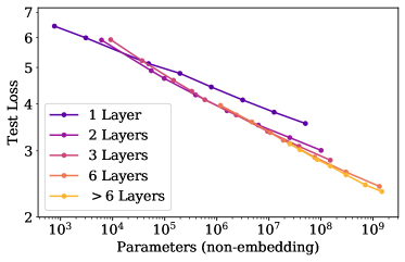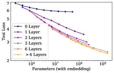 Transformer의 성능은 non-embedding parameter의 개수와 강한 상관관계를 보이지만, 이런 경향성은 embedding matrix를 포함하는 경우에는 잘 적용되지 않는 모습을 보입니다. *embedding matrix를 포함하면 왜 layer의 개수에도 더 큰 영향을 받는지 ..? 오히려 embedding matrix의 크기와 layer의 크기가 어떤 연관성이 있는 것일까? embedding의 크기가 늘어났는데 이를 받춰줄만한 layer의 수가 적으면 오히려 역효과? embedding param과 non-embedding param과 어떤 차이가 있을까?