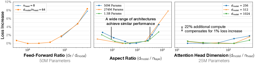 Trasformer의 성능은 embedding parameter가 아닌 parameter의 개수인 N이 고정되는 한, layer나 attn head, ff의 차원과는 별 상관이 없는 것으로 보입니다. *FF Ratio의 경우는 Loss Increase가 dff의 크기가 늘어날 때, 급격히 증가하는 모습을 보이는데 이도 성능에는 별 상관없는 것으로 볼 수 있는건가?