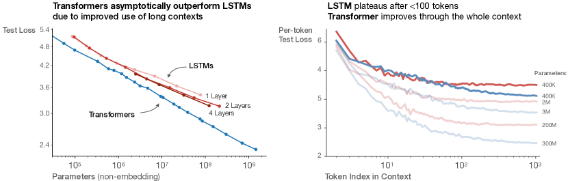 같은 양의 pram수를 사용하는 LSTM과 비교했을 때, context의 앞 부분은 LSTM과 Transformer가 token당 loss가 비슷하지만 뒤로 갈수록 LSTM의 token당 loss가 Transformer에 비해 떨어지는 모습을 보입니다. *LSTM의 장기 의존성