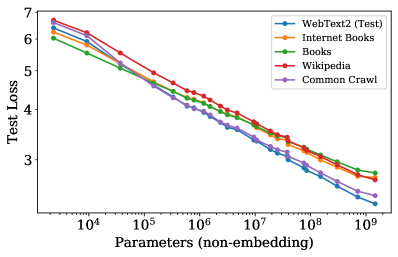WebText2가 아닌 다양한 벤치마크에서도 power-law가 통하는지를 알아보는 실험으로, 다양한 task에도 통함을 보여주고 있습니다.