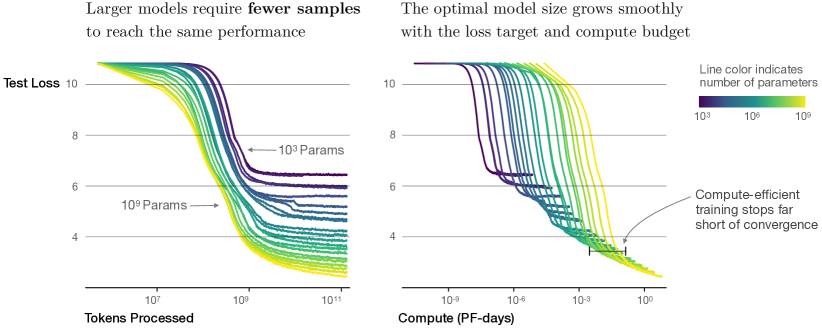 이러한 관계들은 적절한 컴퓨터 자원의 할당등 LM의 최적화에 도움을 줄 수 있습니다. 큰 모델에는 그에 맞는 양의 데이터와 모델의 수렴(* overfitting) 전에 언제 학습을 멈춰야 하는지 등의 sample-efficient가 중요한데, 이에 도움을 줄 수 있습니다.