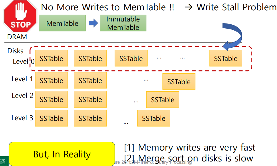 이런 주기적인 Background Compaction이 이뤄져야 Amplification도 줄어들어서, 성능이 좋아지지만, Insertion은 DRAM에서 이뤄지고, Backgroud Compaction은 Disks에서 이뤄지기 때문에 속도 차이가 발생할 수 있습니다. 이런 경우는 Insertion을 Stall함으로써 Background Compaction이 이뤄지기 기다리는 방법을 사용합니다. 이는 당연히 성능을 낮추는 결과를 만들긴 합니다: