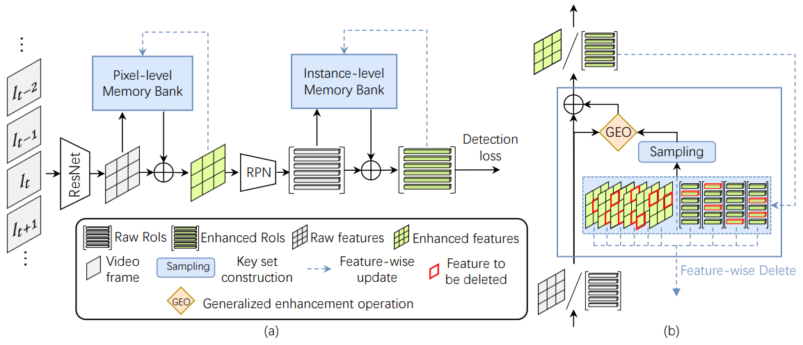 이를 해결하기 위해서 해당 논문에서는 참조하는 정보를 frame단위가 아닌 feature단위로 구성하고, feature들을 모두 사용하는 것이 아닌 sampling하여 참조해야하는 정보들을 선택합니다. 이를 통해 frame의 정보들을 모두 한 번에 concat해서 사용하는 것 보다 계산 효율적으로 문제를 풀 수 있습니다. 또한 frame단위의 업데이트 대신 좀 더 finer-grained한 feature단위의 업데이트를 수행합니다. 아래는 sliding window 방식과 MEGA(Chen et al., 2020)에서 사용한 memory queue 방식, 제안된 방법론의 차이를 그림으로 보여줍니다: