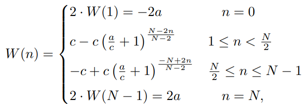 이를 달성하기 위해, bin의 폭을 n에 따라서 달라지도록 설정하는 함수가 W()입니다. W()는 예측하는 n이 중간(N/2)에 멀리 떨어지면(0이나 N에 가까우면) bin의 폭이 크게 크게 달라지고(기울기가 크다), bin의 폭의 값이 -2a나 2a로 큰 값이 설정됩니다. 반면 n이 중간에 가깝다면 bin의 폭이 거의 달라지지 않고(기울기가 작다), bin의 폭의 값이 거의 0에 가까운 값으로 설정됩니다.