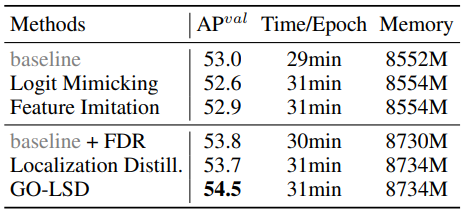 표 5. 는 다른 KD 방법론과 제안한 GO-LSD 방법론을 적용했을 때의 성능 차이를 보여줍니다. 이를 통해 GO-LSD 방법론이 우수함을 증명합니다.