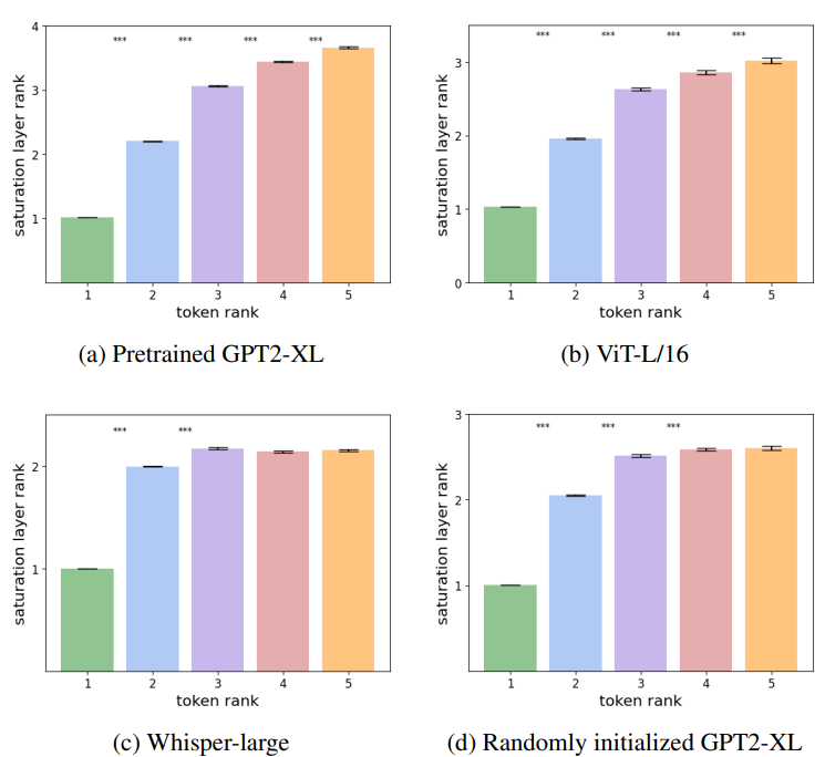 그리고 이를 언어 모델 뿐만 아니라 vision이나 audio에 대해서도 검증하며, GPT와 같은 decoder-only 구조 뿐만 아니라 ViT와 같은 encoder-only, Whisper와 같은 encoder-decoder 구조에 대해서도 이 사실을 검증합니다. 그리고 이 사실이 학습과는 별개로 transformer 구조 자체에 내재된 특성임을 추가적인 실험을 통해 증명합니다.