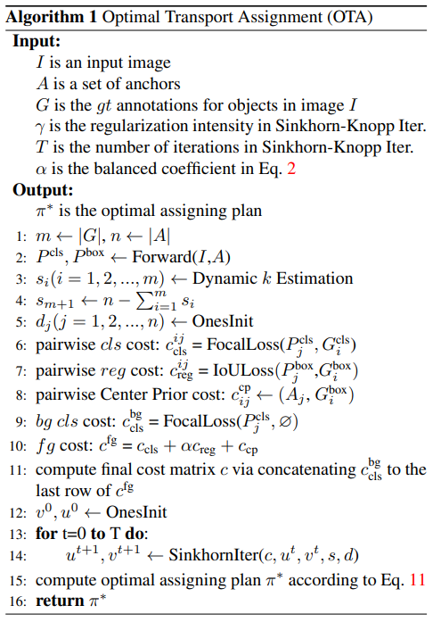 OTA는 레이블 할당을 OT 문제로 공식화합니다. 여기서 m개의 공급자는 GT target이고, n명의 수요자는 이미지 위의 예측(앵커 위치) 입니다. 정답들은 양성 라벨은 수요자인 앵커들에 공급하고, 목표는 양성 라벨을 앵커에 최적으로 공금하는 계획을 찾는 것입니다. 즉, OT 문제를 통해 앵커/예측에 양성/음성을 가장 최적으로 라벨링하는 것이 목표입니다.