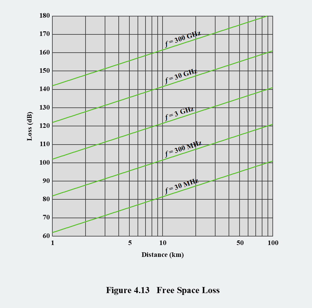 위 그림은 자유 공간 솔실이 거리와 주파수에 따라 어떻게 변하는지를 보여줍니다. 거리가 멀어질수록 손실(loss, dB)은 꾸준히 증가합니다. 동일한 거리에서는 주파수가 높을 수록 손실이 더 콥니다. 이는 고주파 신호일수록 더 많은 에너지를 잃기 때문에 장거리 통신을 위해서는 더 높은 송신 전력이나 더 높은 이득을 가진 안테나가 필요함을 의미합니다.