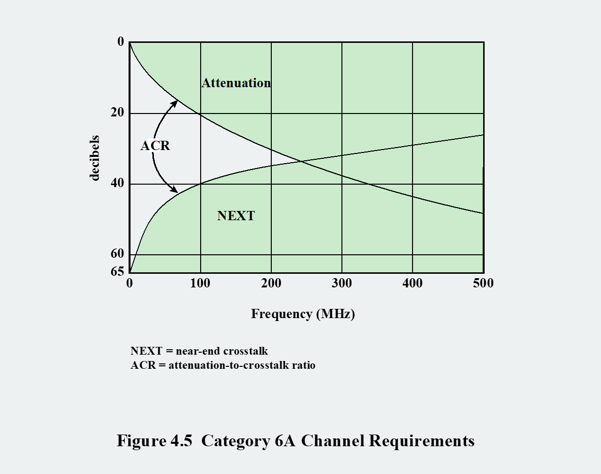 위 그림은 주파수에 따른 Attenuation과 NEXT의 관계를 보여줍니다. Attenuation은 주파수가 높아질수록 심해지기 때문에 유효한 신호의 세기가 점점 약해집니다. 한편, 주파수가 높아질수록 꼬임의 효과가 줄어들어 crosstalk이 더 심해집니다. 즉 NEXT loss의 값은 낮아집니다(노이즈가 강해집니다). ACR은 이 두 곡선 사이의 간격, 즉 신호와 노이즈의 차이를 의미합니다. 통신이 가능하려면 신호(감쇠 곡선 아래)가 노이즈(NEXT 곡선 위)보다 충분히 커야 합니다. 두 곡선이 만나는 지점에서는 신호와 노이즈의 크기가 같아져 더 이상 통신이 불가능해집니다. 따라서 케이블의 유효 대역폭은 ACR이 +값을 갖는 주파수 범위로 제한됩니다.