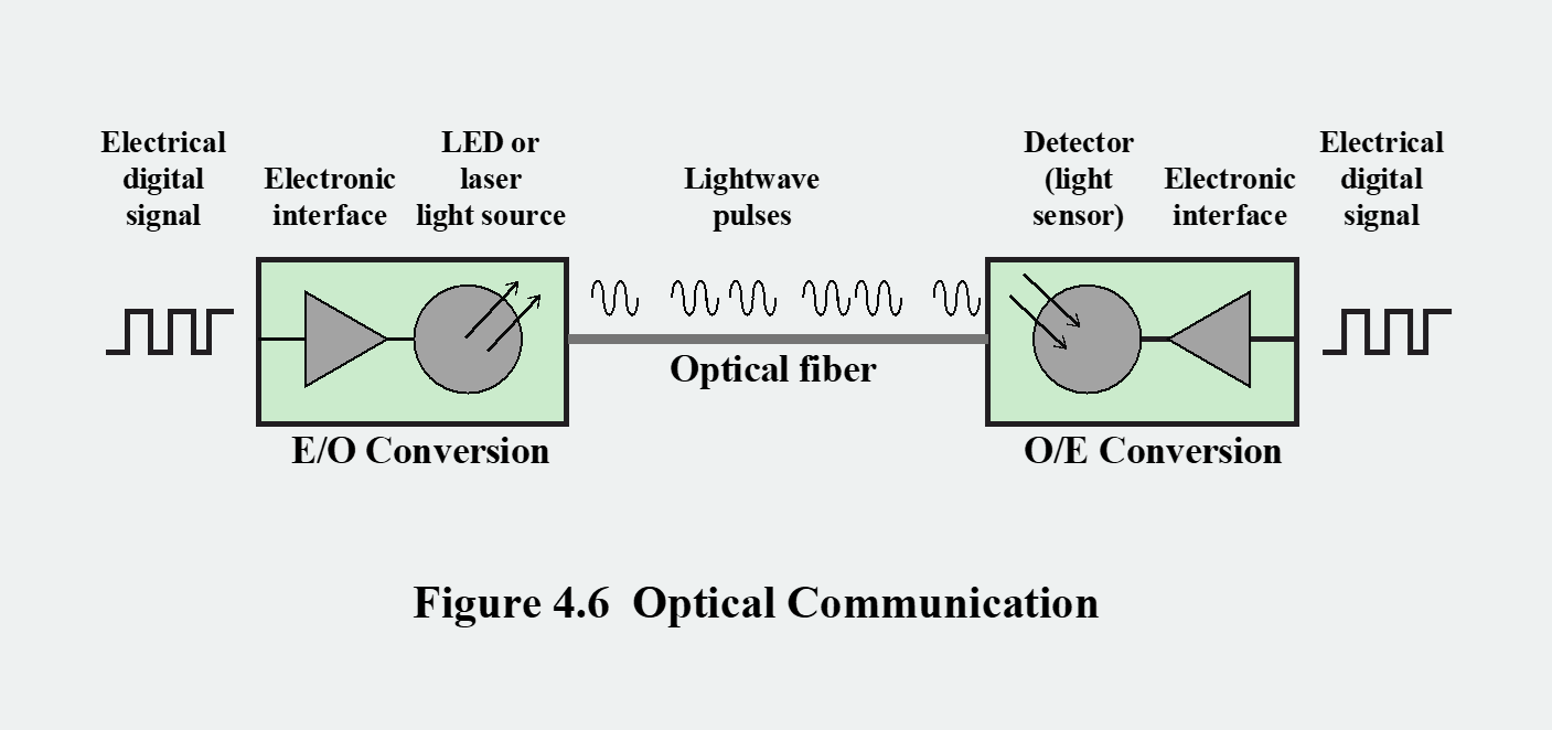 위 그림은 광통신이 이루어지는 기본 과정을 보여줍니다. 송신단에서는 전기적 디지털 신호가 들어오면 광원(light source)인 LED나 레이저가 이 전기 신호를 광펄스(빛의 반짝임)으로 변환합니다. 생성된 광펄스는 광섬유를 통해 목적지까지 전달되며, 광검출기(detector)가 광섬유를 통해 들어온 빛 신호를 감지합니다.
