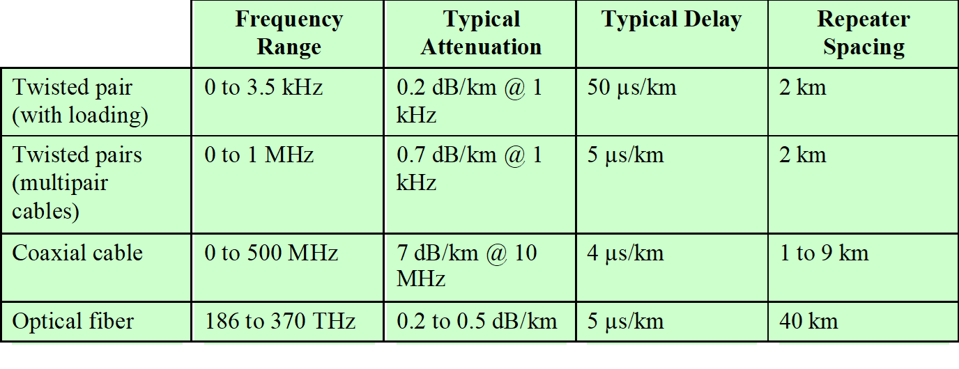 위 표는 대표적인 guided media 세 가지의 물리적인 특성을 비교하여 보여줍니다.