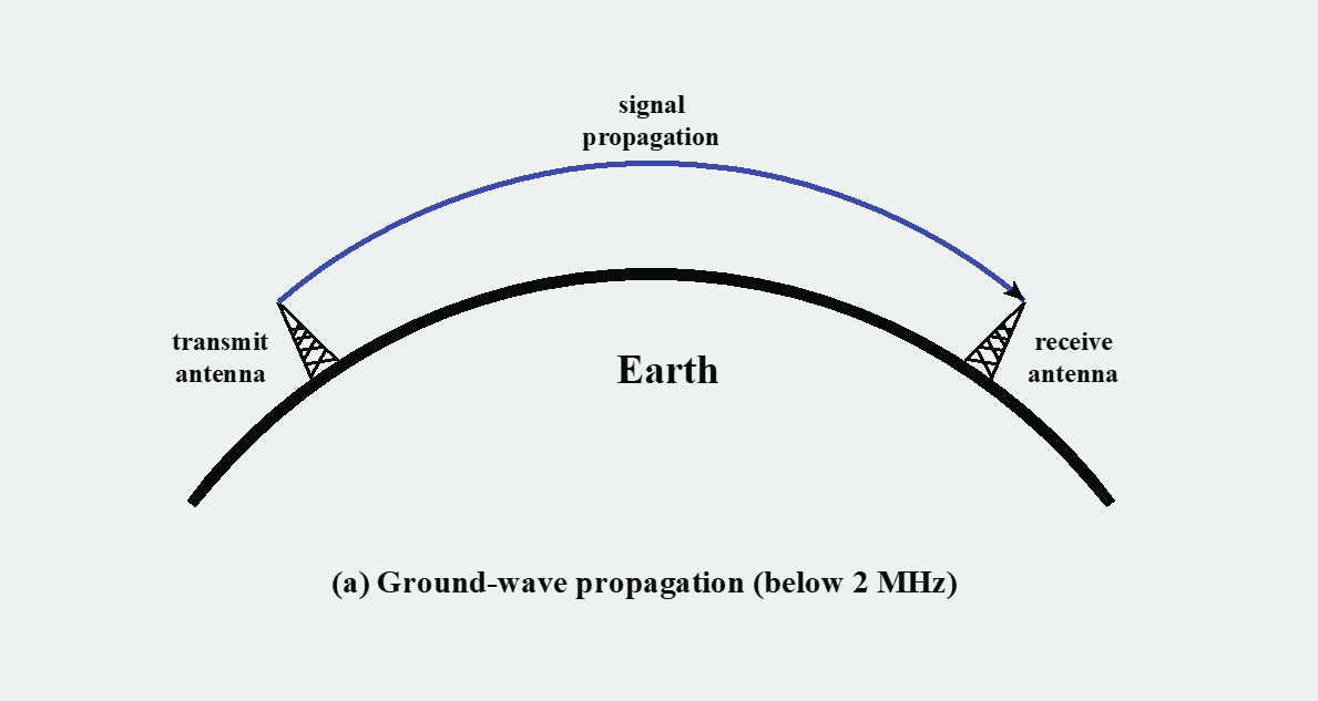 위 그림은 지표파(ground wave) 전파 방식을 보여줍니다. 지표파는 지구 표면의 윤곽을 따라 휘어지며 전파되는 특성이 있어, 가시적인 수평선 너머까지 신호를 전달할수 있습니다. 이 현상은 주로 2MHz 이하의 낮은 주파수에서 나타납니다. 주파수가 높을수록 지표면의 손실이 커져 멀리 가지 못합니다. 가장 잘 알려진 예는 AM 라디오 방송입니다. AM 라디오가 산이나 언덕 너머에서도 수신될 수 있는 이유입니다.