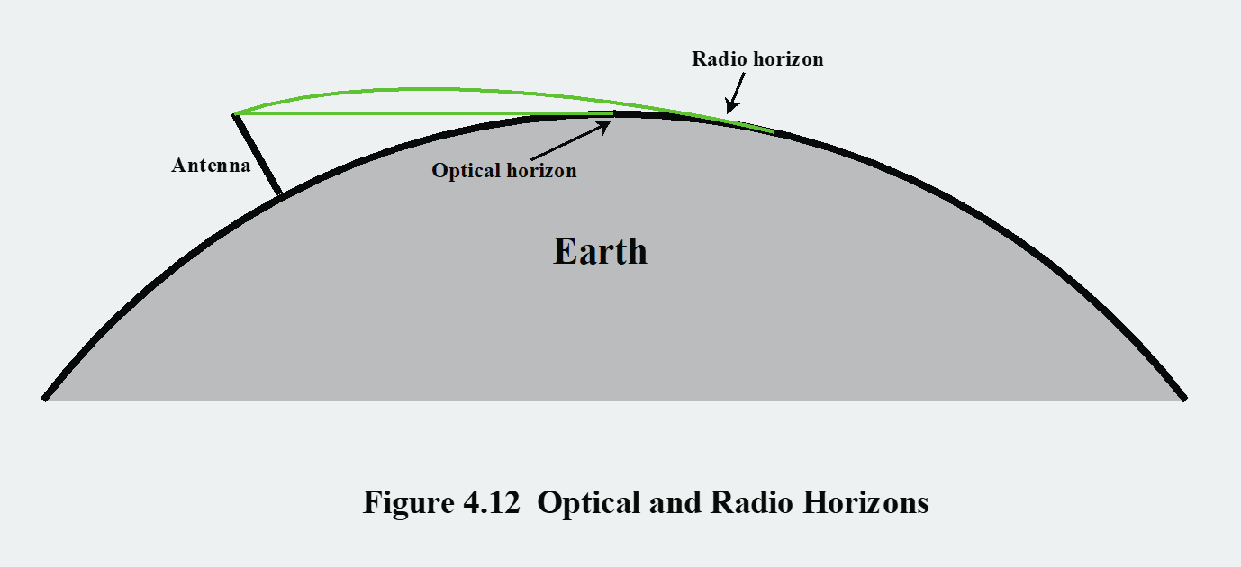 이러한 대기 중 굴절 현상은 LOS 통신 거리에 영향을 미칩니다. 광학적 수평선(optical horizon)은 우리 눈으로 볼 수 있는 직선거리의 한계입니다. 지구의 곡률 때문에 제한되는 반면, 전파 수평선(radio horizon)은 전파가 대기 굴절에 의해 휘어지기 때문에, 실제로는 광학적 수평선보다 조금 더 먼 거리까지 도달할 수 있습니다. 이를 "유효 지구 반경" 개념을 사용하여 계산하기도 합니다. 결론적으로, 전파의 굴절 덕분에 실제 통신 가능 거리는 눈으로 보이는 거리보다 더 길어집니다.