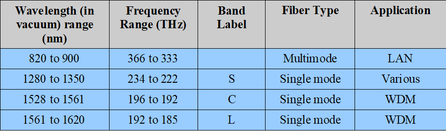 이 표는 광섬유 통신에 사용되는 빛의 파장 및 주파수 대역을 보여줍니다.