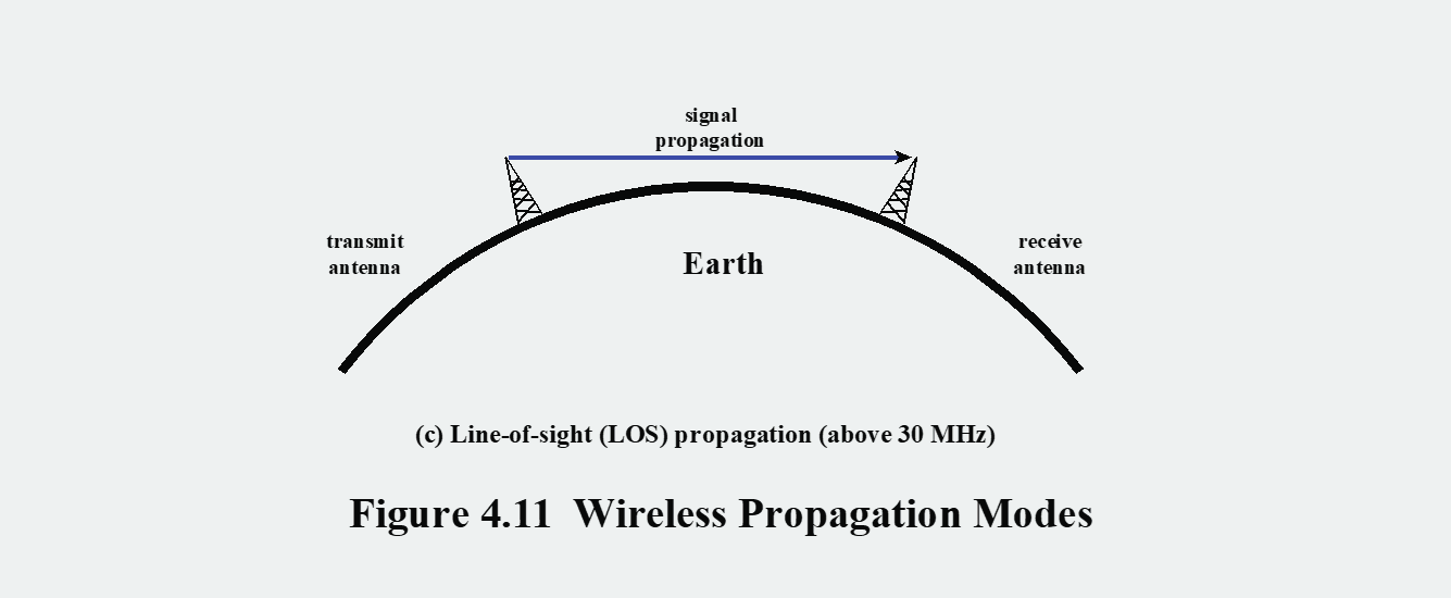 위 그림은 가시선(LOS) 전파 방식을 보여줍니다. 송신 안테나와 수신 안테나가 서로를 직접 볼 수 있는, 즉 두 안테나 사이에 장애물이 없는 직선 경로를 통해 통신하는 방식입니다. 지표파나 하늘파가 작동하지 않는 30MHz 이상의 매우 높은 주파수에서는 통신이 반드시 이 LOS 전파에 의존해야합니다. FM 라디오, TV 방송, 휴대폰, 마이크로파 통신, 위성 통신 등 오늘날 대부분의 무선 통신이 이 방식에 해당합니다.
