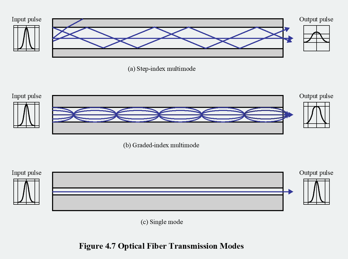 (a) step-index multimode: 코어의 굴절률이 균일하고, 코어와 클래딩의 경계에서 굴절률이 계단처럼 변하는 구조입니다. 여러 개의 빛 경로(mode)가 각기 다른 각도와 길이로 진행하기 때문에, 목적지에 도착하는 시간이 제각각 달라집니다. 이로 인해 원래 네모난 입력 펄스가 도착 후에는 modal dispersion(모드 분산) 현상으로 인해 뭉툭하게 퍼지게 됩니다. 이는 전송 속도(data rate)를 제한하는 요인이 됩니다.