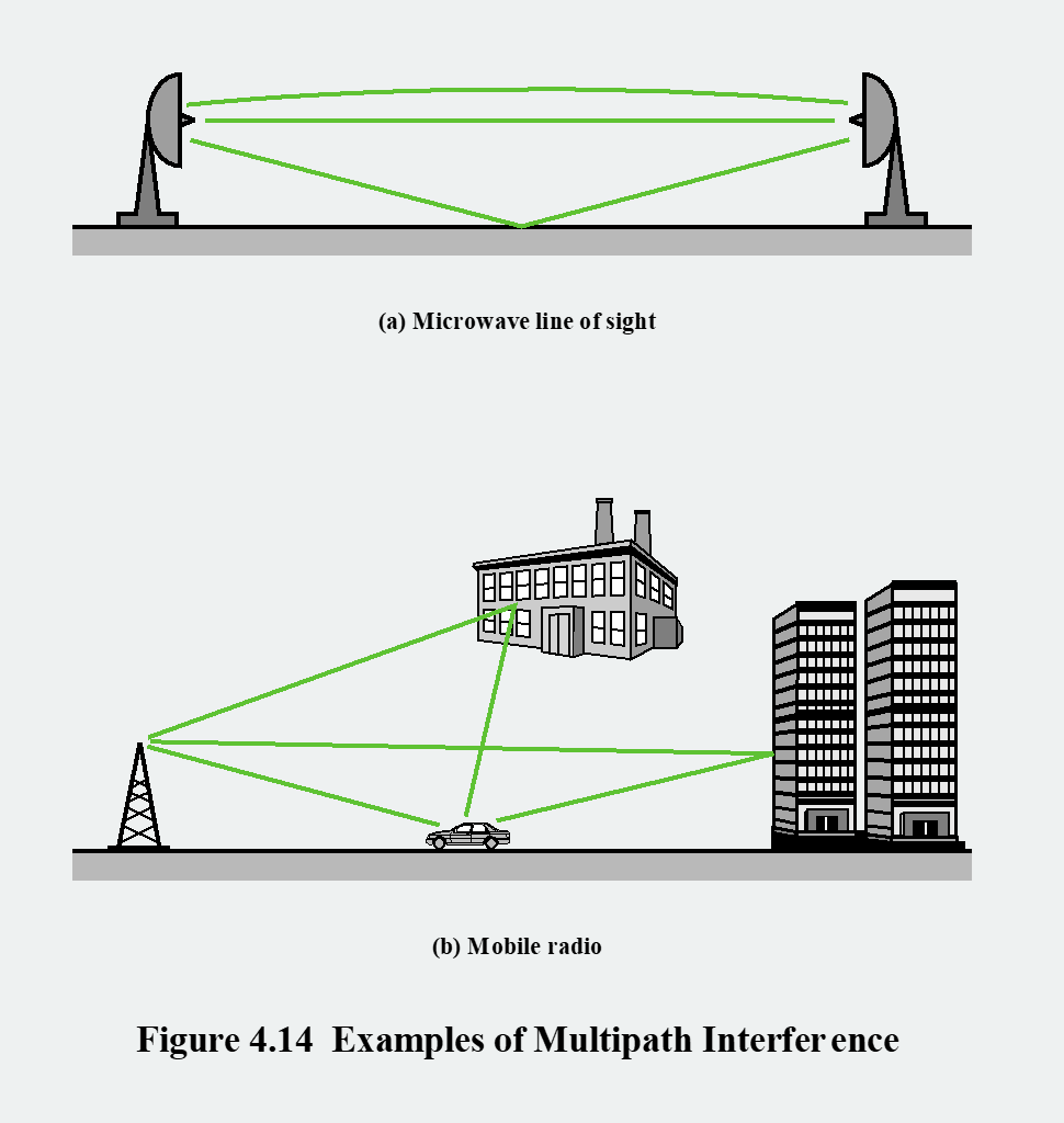 (a) 마이크로파 LOS 통신: 송신 안테나에서 보낸 신호가 수신 안테나로 직접 가는 경로 외에도, 지면에 한 번 반사되어 가는 경로가 존재할 수 있습니다. 두 신호가 시간 차를 두고 합쳐지면서 간섭이 발생합니다.