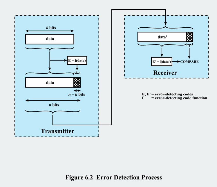전송할 원본 데이터 k비트가 있습니다. 이는 미리 약속된 함수 f(오류 감지 알고리즘)를 사용하여 이 데이터로부터 오류 감지 코드(E)를 계산합니다(예: 체크섬, CRC값). 이 코드 E는 n-k 비트이며, 원본 데이터 뒤에 덧붙여져 총 n비트의 프레임을 구성해 전송합니다. 수신측은 n 비트 프레임을 수신하며, 수신한 데이터 부분(data')을 송신측과 똑같은 함수 f에 입력하여 새로운 오류 감지 코드 E'를 계산합니다. 그 후 프레임과 함꼐 실려온 E와 방금 계산한 E'을 비교합니다.