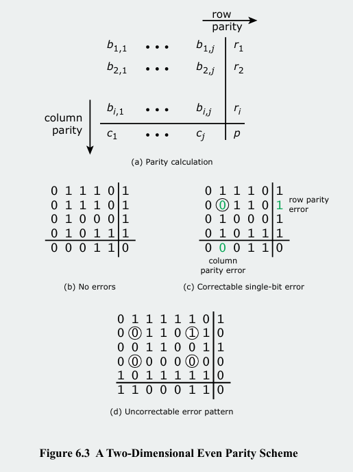 (c)는 단일 비트 오류로, 해당 비트가 속한 행의 패리티가 불일치 하고 열의 패리티도 불일치 하게 됩니다. 수신측은 오류가 발생한 행과 열의 교차점을 특정하여, 해당 비트를 다시 뒤집음으로써 오류를 수정(correction)할 수 있습니다.