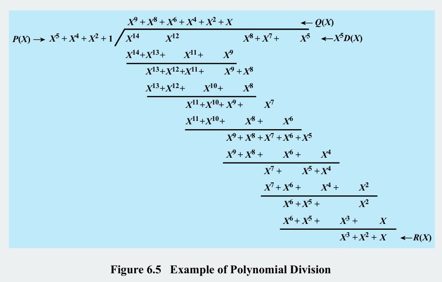 위 그림은 예시입니다. 데이터 D(X)에 FCS의 (최고) 비트 수(이 경우 5)만큼 0을 덧붙입니다(수학적으로 X^5를 곱하는 것). 이를 생성 다항식(generator polynomial) P(X)로 나눕니다. 나눗셈 과정에서 뺄셈은 XOR을 사용합니다. 이떄 발생하는 몫 Q(X)는 사용하지 않고 버립니다. 최종적으로 남는 나머지 R(X)가 바로 송신자가 데이터 뒤에 붙여 보낼 FCS가 됩니다(비트 열로 01110).