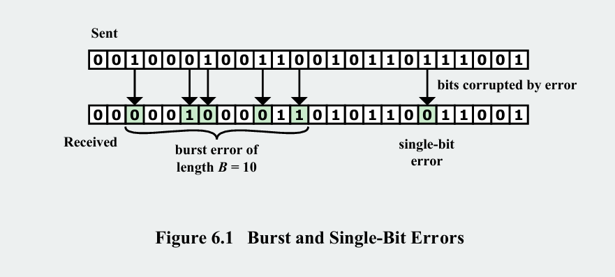 실제 유선 및 무선 통신 환경에서는 단일 비트 오류 보단는 버스트 오류가 훨씬 더 일반적입니다. 따라서 대부분의 현대 오류 감지 코드(특히 CRC)는 이 버스트 오류를 감지하는 데 특화되어 있습니다.