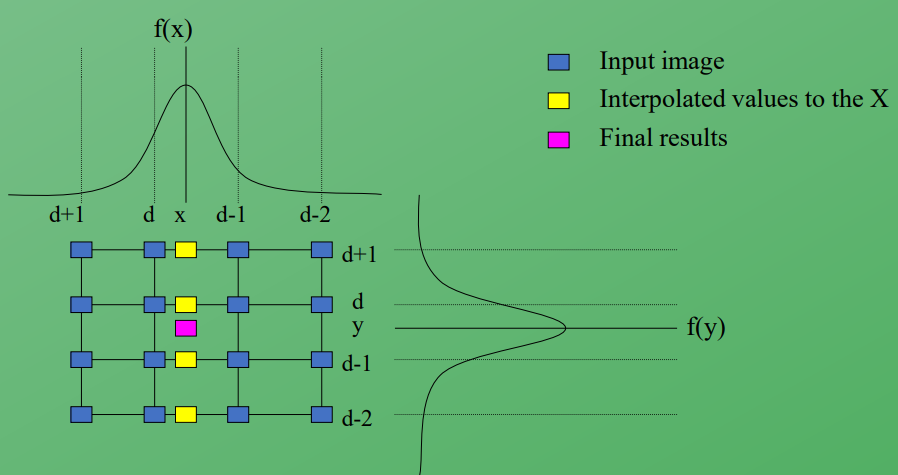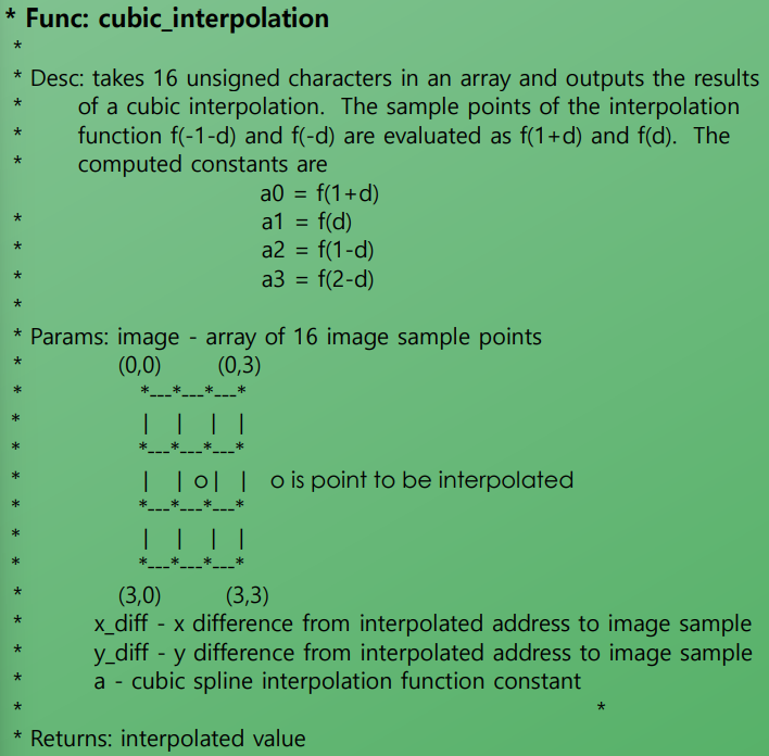 이는 주변 16개의 점들을 이용하기 때문에 계산 비용이 비싸지만, 어디든 continuous한 결과를 볼 수 있다는 장점이 있습니다. 이는 비선형 보간 함수(interpolation function)을 사용하여, 행 축으로 4번의 보간, 열 축으로 1번의 보간을 통해 구현됩니다: