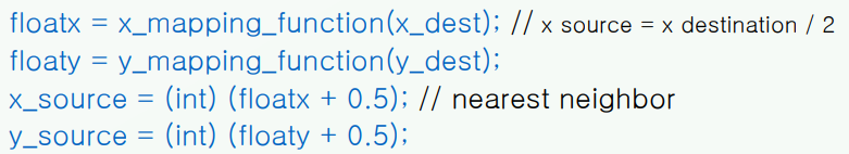 destination location (x',y')에 해당하는 backward source location (x,y)가 있다고 했을 때, I(x',y')값을 I(round(x), round(y))로 설정합니다: