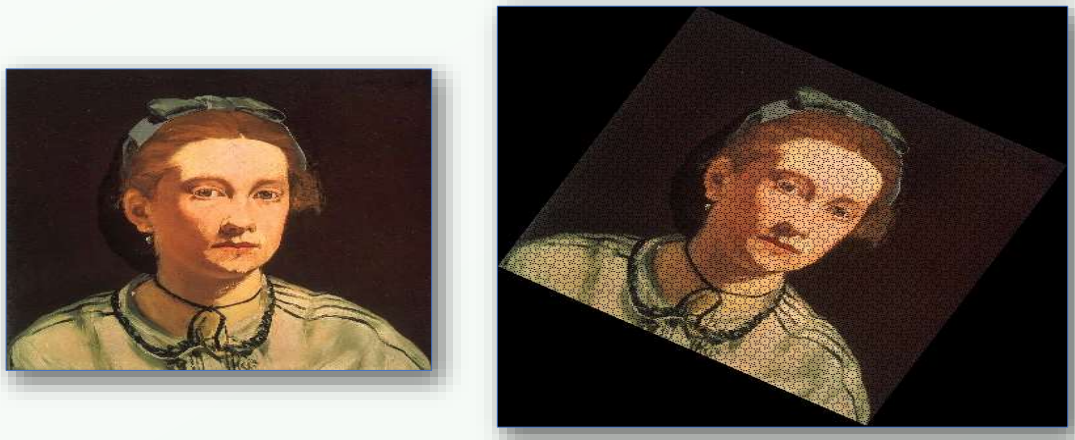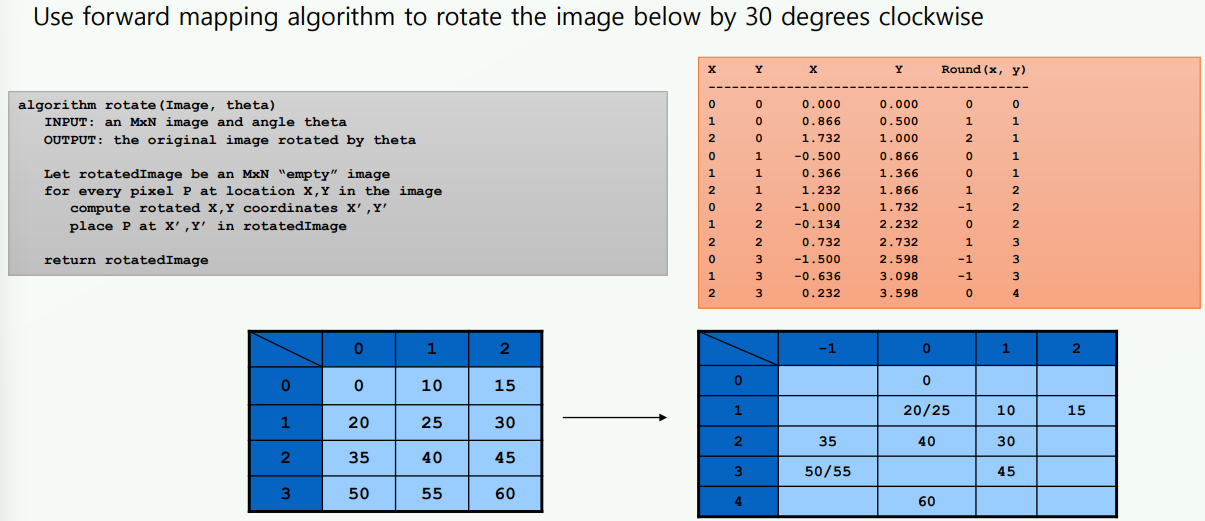 우선 처리된 이미지의 픽셀값이 integer value가 아니라면, 반올림을 통해 억지로 integer 좌표로 변환할 수 있습니다. 원본 픽셀 (x,y)를 하나씩 가져와서 변환 공식에 넣고, 나온 결과 (x',y')를 반올림하여 결과 영상에 찍으면 아래의 그림처럼 구멍이 생길 수 있습니다: