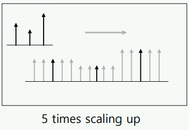 위 그림은 5배 scaling up하는 경우의 예시입니다. 검은색 화살표는 source image pixel value이고, 회색 화살표는 destination image pixel value입니다. NN 방법을 사용하는 경우, 그냥 가장 가까운 source image pixel value를 복사하는 것이기 때문에, 아래의 (c)와 같은 결과가 발생할 수 있습니다.