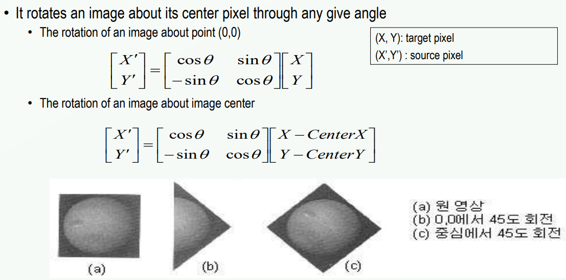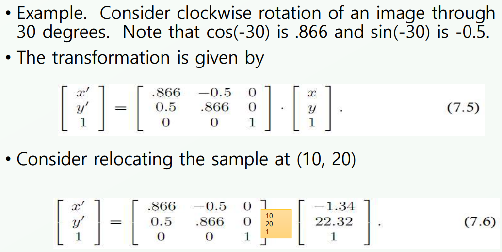 - Rotation(회전): 삼각함수를 이용한 선형 변환입니다.