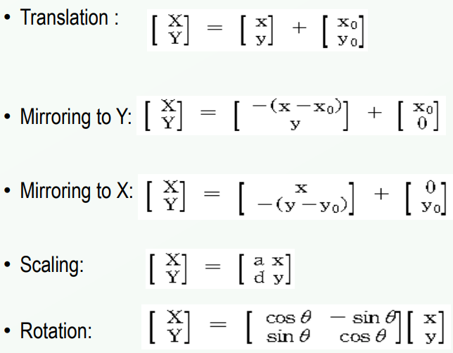 - Mirroring(미러링): 축 대칭입니다. x축 대칭은 y좌표의 부호를, y축 대칭은 x좌표의 부호를 반대로 뒵집고 원점 보정을 위해 x0, y0 등을 더합니다.