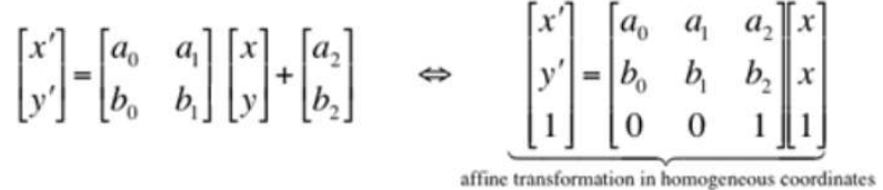 Tx()같은 경우는 x와 y의 linear combination과 m02(shift를 위한 계수)의 합으로 이뤄집니다. Ty()도 마찬가지입니다. 이를 행렬로 나타낸 것을 Homogeneous transformation matrix라고 부릅니다.