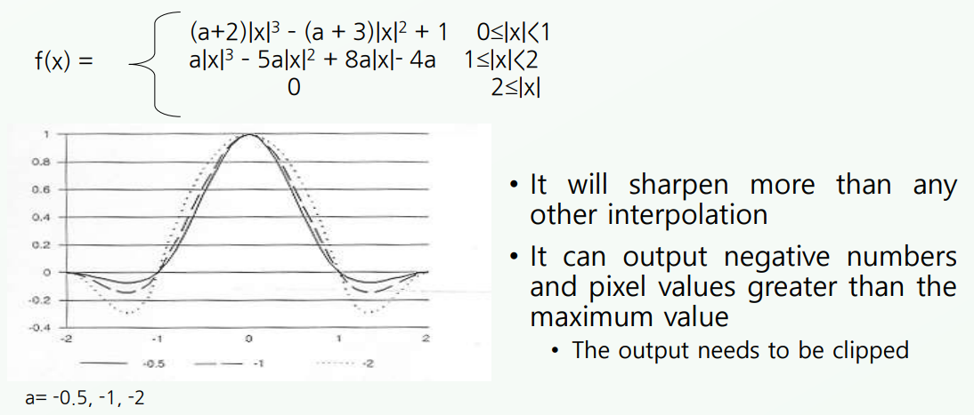 아래는 cubic convolution interpolation에서 사용하는 보간 함수의 모습입니다. 이때 a를 조절함으로써 sharpening 정도를 조절할 수 있습니다(음수가 들어가 있기 때문에).