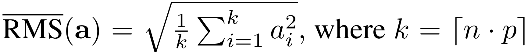 RMSNorm의 re-scaling invariance 특징은 linearity로 인해 가능한 것입니다. 한 layer 내의 뉴런들이 i.i.d 의 구조를 종종(?) 가진다는 점에서 해당 논문의 저자들은 RMS가 이 뉴런들의 부분집합으로부터 추정될 수 있다고 주장합니다. 이를 partial RMSNorm이라고 부릅니다. 아직 정규화되지 않은 입력 a가 주어졌을 때, pRMSNorm은 RMS 통계량을 a의 처음 p% 요소들로부터 다음과 같이 추론할 수 있습니다: