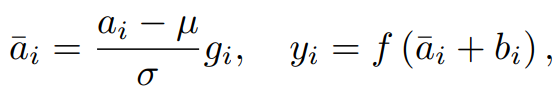a_bar는 a의 정규화된 대안으로서 동작하며, g는 표준화된 입력들을 re-scale하는 데 사용되는 파라미터이며 1로 초기화됩니다. μ와 σ는 평균과 표준편차이며, 이는 각각 다음과 같이 계산됩니다: