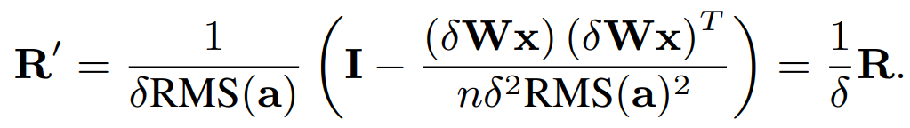 논문의 저자는 R항이 입력(x)와 가중치 행렬(W) 스케일링 둘 다와 음의 상관관계를 갖는다는 것을 발견했습니다. delta라는 스케일을 입력 x(x' = (delta)x) 혹은 가중치 행렬 W(W' = (delta)W)에 할당하면, 다음과 같은 R'을 구할 수 있습니다:
