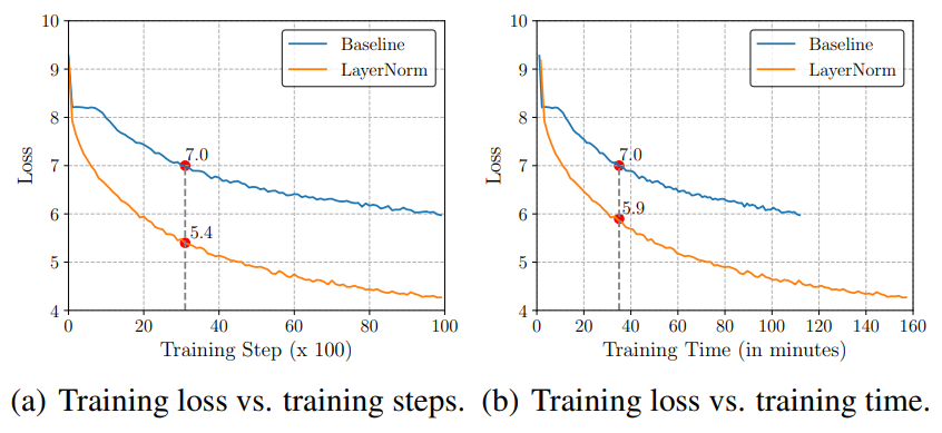 그림 1. 은 이를 보여줍니다. (a)를 보면 같은 training step에서 baseline은 7.0의 loss를 기록했을 때, LayerNorm을 적용한다면 5.4의 loss를 기록함으로써, training step의 관점에서는 LayerNorm이 1.6%p의 loss상의 이득을 볼 수 있었습니다. 하지만, (b)를 보면 baseline이 7.0의 loss를 기록할 때, LayerNorm은 5.9의 loss를 기록함으로써, LayerNorm의 계산 지연으로 인해 학습 시간의 측면에서는 1.1%p 정도의 이득만 볼 수 있었습니다.