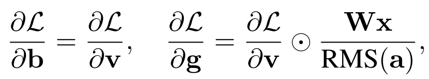 두 gradients 보두 위에서 설명한 RMS의 선형성으로 인해 x와 가중치 행렬 W의 스케일링에 대해 invariance 성질을 갖습니다. 이 벡터 파라미터들과 달리, 가중치 행렬 W의 gradient는 더 복잡합니다:
