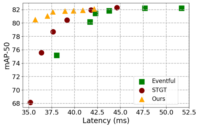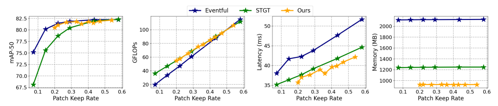 그림 6. 은 비디오 추론 가속화를 위해 프레임 간의 시간 중복성을 활용하는 데 중점을 둔 SOTA 방법들, 즉 Eventful-Transformer 및 STGT와 논문의 모델을 비교한 표입니다. (... 좋다는 얘기 ...)