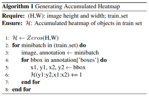 static mask의 목적은 데이터셋 내에서 객체가 더 빈번하게 등장하는 영역을 식별하는 것입니다. 탐지 작업의 경우, 이 정보는 학습 데이터셋의 GT Bbox에서 쉽게 얻을 수 있습니다. 아래의 알고리즘 1. 을 이용하여 객체들의 누적 heatmap을 얻는 데 이 정보를 사용합니다: