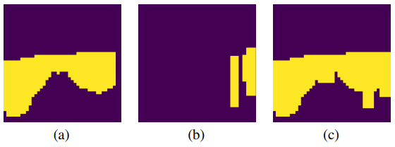 그 후, combined input mask를 얻기 위해 static mask와 dynamic mask에 의해 선택된 영역들의 합집합을 취합니다. 이 마스크는 완전히 처리되는 프레임(오류 누적을 막기 위해 마스크 없이 처리되는 프레임)을 제외한 모든 프레임에 대해 탐지 모델의 입력으로 적용됩니다. 새로운 객체를 고려하고 탐지된 Bbox 로부터 마스크의 오류가 누적되는 것을 방지하기 위해, 주기적으로 전체 프레임을 마스킹 없이 처리합니다. 예를 들어, 주기 P에 대해 매 P 프레임 윈도우의 첫 번째 프레임은 마스크 없이 처리되고, 그 뒤의 (P-1)개의 프레임을 마스킹 됩니다. 프레임 t에 대한 마스크는 프레임 (t-1)의 정보로부터 추정됩니다. 아래의 그림은 combined input mask의 예시입니다: