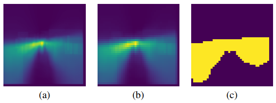 그림 2(a).에 나타난 KITTI 학습 세트의 누적 heatmap에서 알 수 있듯이, 자율 주행 작업에서 객체는 주로 도로를 따라 나타납니다. 또한 하늘과 같이 절대 객체가 나타나지 않는 영역도 존재합니다. H의 픽셀별 값들은 누적되어 영역별 점수 2(b).를 얻을 수 있습니다. 영역 크기는 ViTDet 모델 백본의 패치 크기에 맞춰 16x16 픽셀로 선택되며, 마스크의 정적 유지 비율(k_s)에 기초하여, 영역 점수가 높은 상위 k개의 패치가 추가 처리를 위해 선택됩니다.