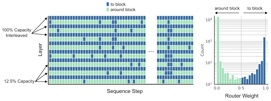 - 블록별 router를 사용하여 각 토큰에 대해 scalar 가중치를 생성합니다. 이는 해당 토큰이 블록의 연산에 참여하거나 혹은 우회하기를 바라는 router의 선호도를 나타냅니다.