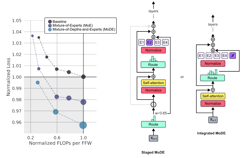 그림 7.은 MoE와 MoD를 합친 MoDE의 성능과 두 가지 변형을 그림으로 나타낸 것입니다.