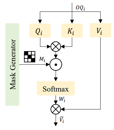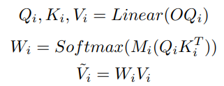 위 그림 3.은 mask self-attention 모듈의 상세한 구현입니다. OQ_i는 linear projection을 통해 Q_i, K_i, V_i를 얻습니다. 그런 다음, Q_i와 K_i를 곱하여 attention score를 계산하고, 이는 M_i와 추가로 곱해진 후 softmax 함수를 통과하여 perturbated attention score를 산출합니다. 마지막으로, 이 attention score는 V_i와 곱해져 융합된 \tildeV_i를 얻습니다. 이 과정은 다음과 같이 표현할 수 있습니다: